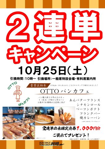 10月25日 2連単キャンペーン 2025年10月14日2025年10月14日 ボートピア川崎 2連単キャンペーン 10月25日(土) 引換:10時~ 一般席特設会場・有料席案内所(無くなり次第終了) 2連単の未確定舟券1,000円分ご提示でOTTOパンをプレゼント!当日の全開催場対象、未確定舟券の合算可。 詳細はこちらから♪