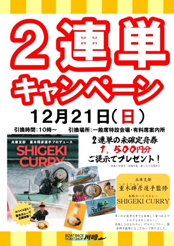 12月21日 2連単キャンペーン 2025年12月11日2025年12月11日 ボートピア川崎 2連単キャンペーン 12月21日(日) 引換:10時~ 一般席特設会場・有料席案内所(無くなり次第終了) 2連単の未確定舟券1,500円分ご提示で兵庫支部ボートレーサー重木輝彦選手監修「SHIGEKI CURRY」をプレゼント!当日の全開催場対象、未確定舟券の合算可。 詳細はこちらから♪