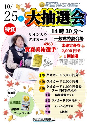 10月25日 サイン入りクオカードが当たる大抽選会 2025年10月14日2025年10月14日 SG津ボートレースダービー特別イベント 大抽選会 10月25日(土)14時30分~ 一般席特設会場 特賞は實森美祐選手のサイン入りクオカード!! その他大人気のクオカードが当たるかも!? 皆様のご参加お待ちしております!! 詳細はこちら☜