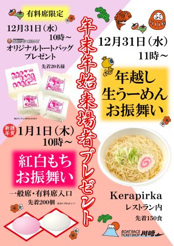 年末年始イベント 2025年12月21日 ボートピア川崎 年末年始イベント 12月31日(水)11時~ Kerapirkaレストラン内 年越し生うーめんお振舞い 有料席限定 大村クイーンズクライマックスオリジナルエコバックプレゼント 1月1日(木)10時~ 一般席・有料席入口 紅白もちお振舞い 拡大PDFはこちら